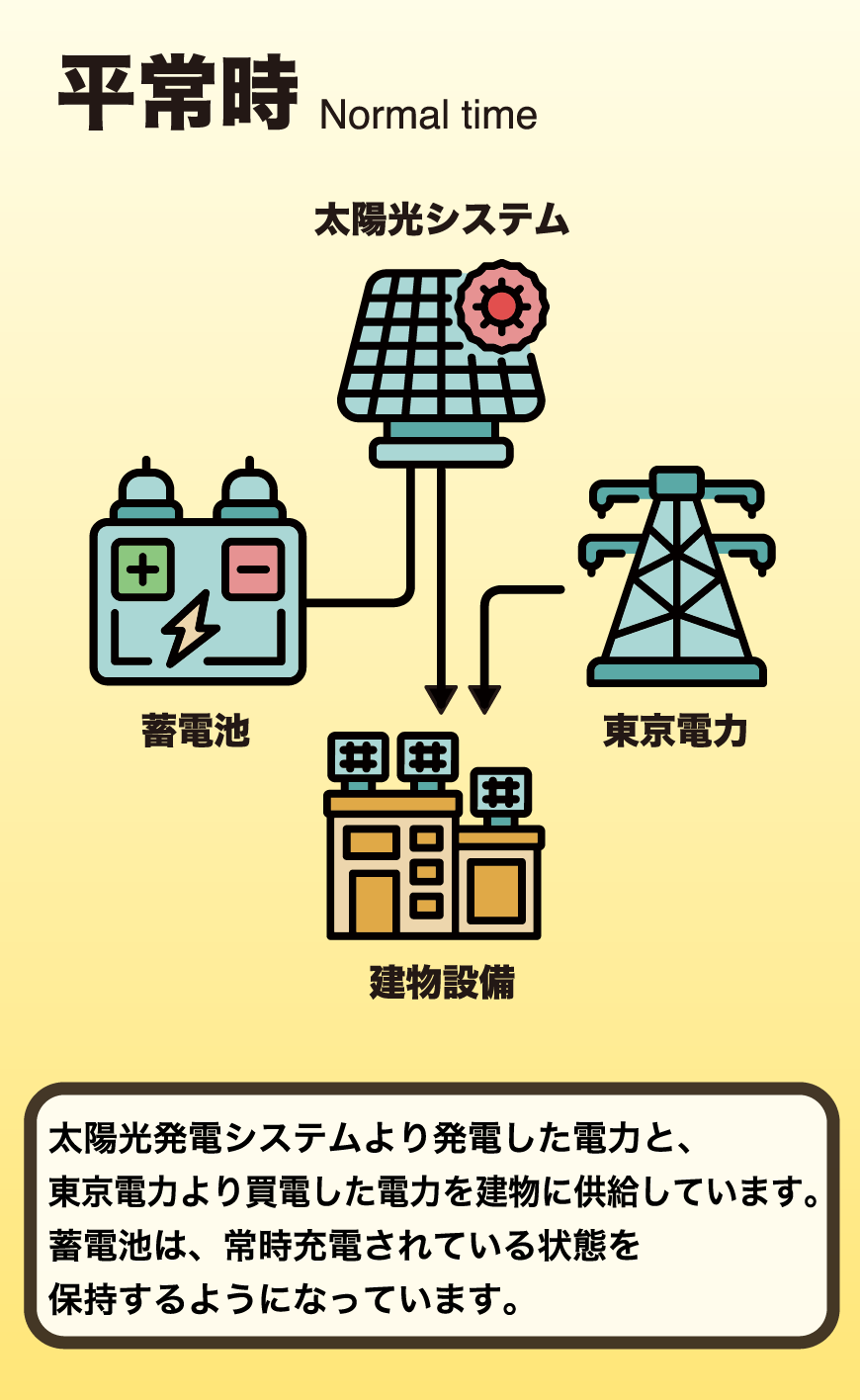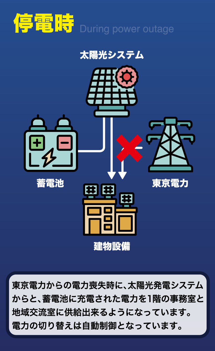 日中に発電した電気はまず家電で消費され、そこで使い切らずに余った電気を蓄電池に貯めます。